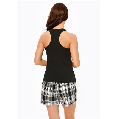 Пижама в стильную клетку выполнен из приятного телу дышащего хлопка. Добавление эластичной нити в состав майки улучшает ее посадку. Широкие бретели и спинка-боксерка создают оптимальную посадку. И, конечно, трендовое рибовое полотно. Главный тренд — шорты в мужском стиле — они нужны каждой в этом сезоне! Гульфик на пуговицах — маленькая шалость. Широкая мягкая резинка на поясе — значительный плюс. Состав: 89%Cotton/11%Elastane.
