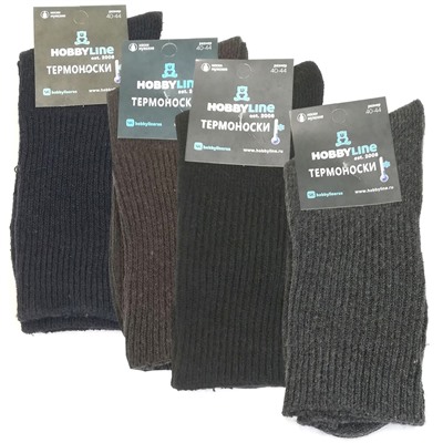 Термоноски бренда Hobby Line для мужчин из однотонного вязаного трикотажа. Процентное соотношение волокон: 91% акрил, 5% нейлон, 3% полиэстер, 1% эластан. Полиэстер и эластан увеличивают изностойкость изделия и придают ему комфортную посадку. Акрил обладает низкой теплопроводностью, мягкий и гипоаллергенный, похож в этом на шерсть. Нейлон легкий, но прочный, сохраняет форму, не пропускает холодный воздух, поэтому его добавляют часто в состав термоносков. Модель с высоким паголенком в рубчик. Мысок с плоским швом.