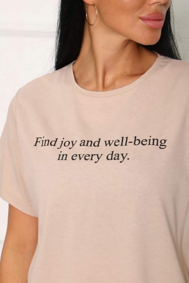 Костюм женский, лаконичный стиль: футболка прямого кроя, с короткими рукавами, с принтом в виде надписи на полочке и шорты на комфортном поясе, с удобными боковыми карманами.
