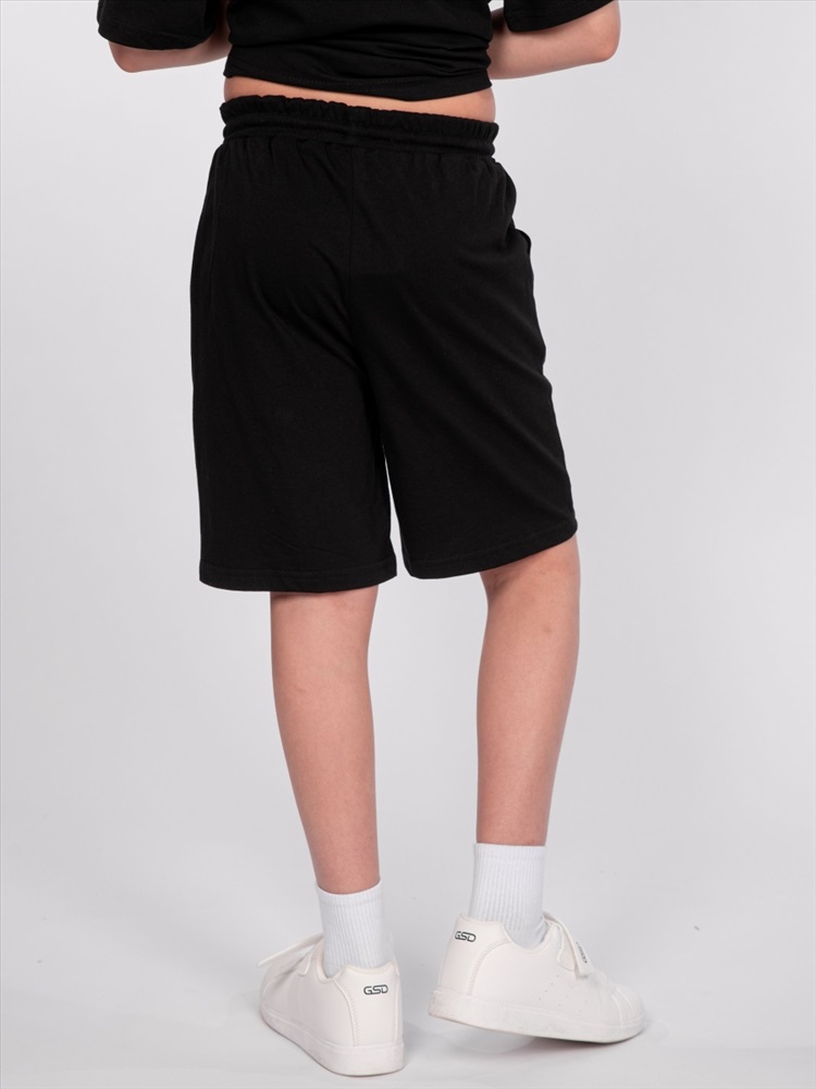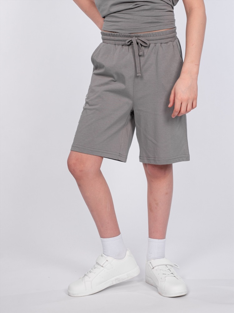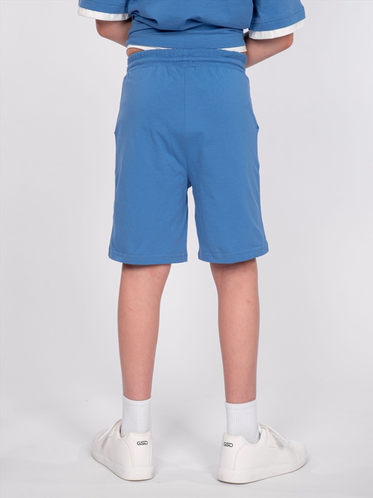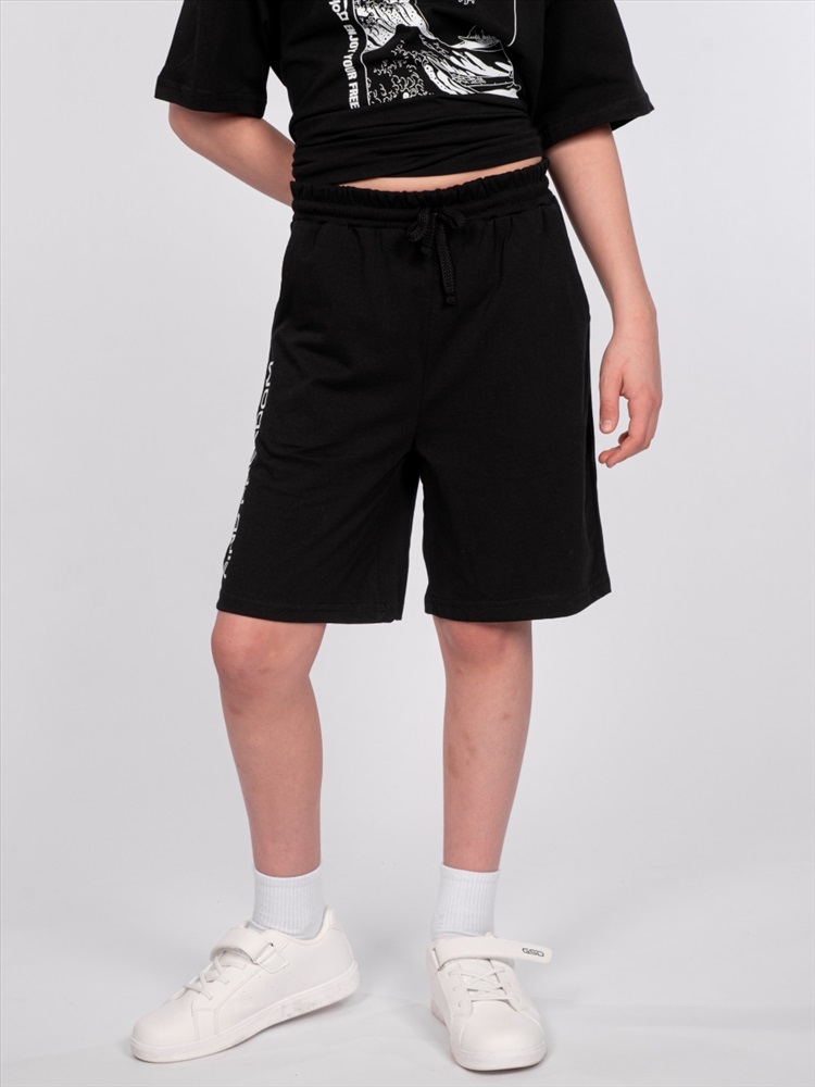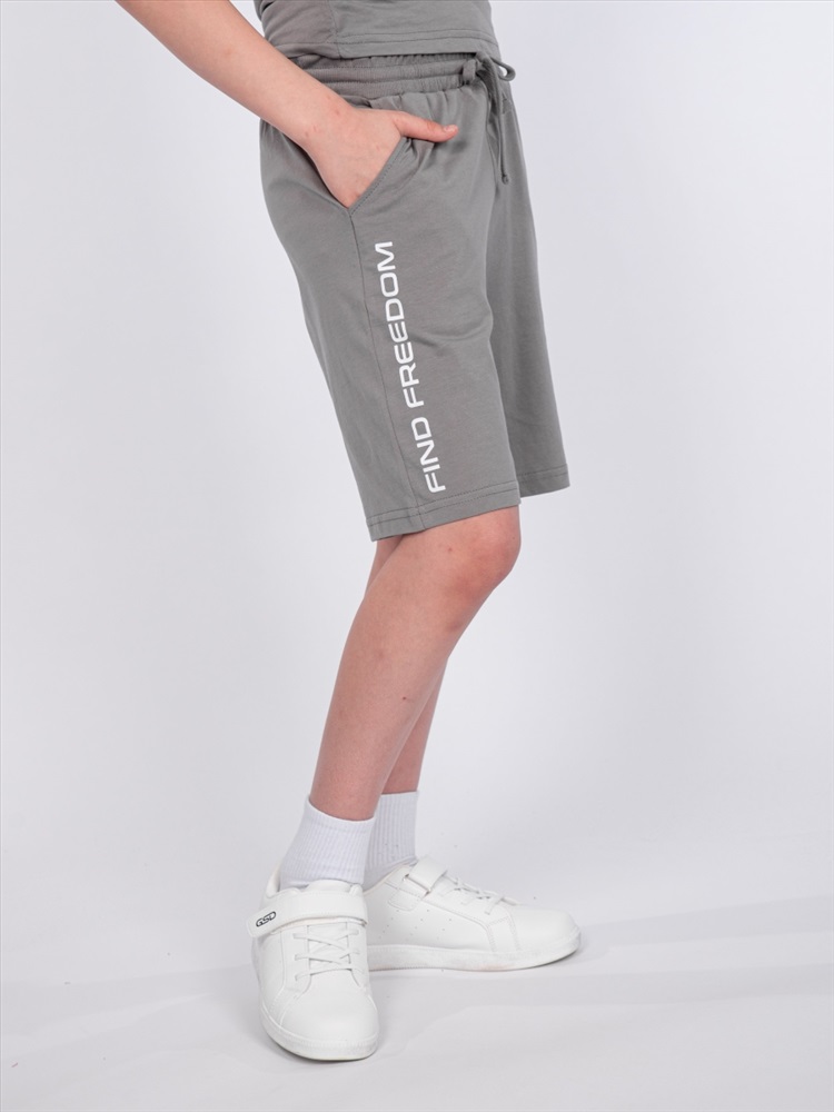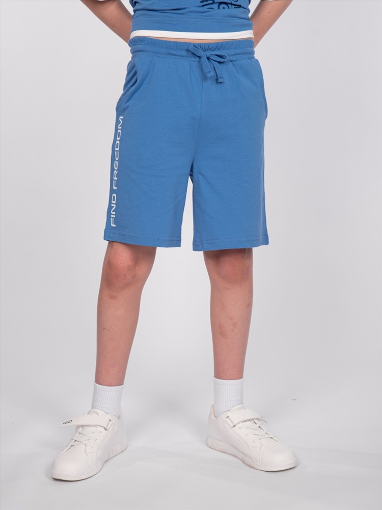 Шорты для мальчика прямого силуэта. Пояс отрезной выполнен из основного полотна, с эластичной резинкой внутри. По поясу шорт вставлен плоский утягивающий шнурок. На передних половинках шорт выполнены карманы с отрезным бочком. Низ изделия обработан швом вподгибку. На передней половинке шорт принт шелкография в виде надписи (перевод "Обрети свободу").