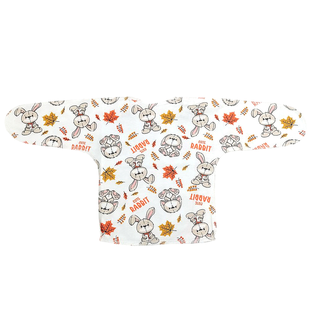 Распашонка с запахом от ТМ "Малышок" (собственное производство). Модель свободного кроя, выполнена из х/б трикотажа (интерлок). Декорирована надписью "Cute rabbit" и принтом "Зайчата". Рукав с варежкой антицарапкой. Застежка кнопки снаружи с левой стороны, изнутри с правой стороны. Наружные швы. Комментарии к товару
