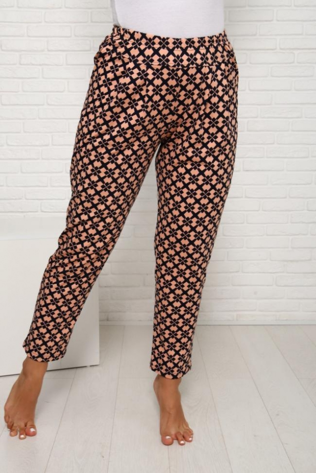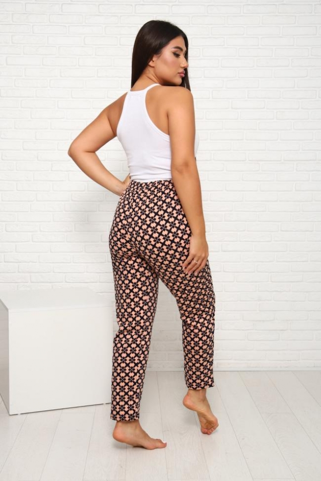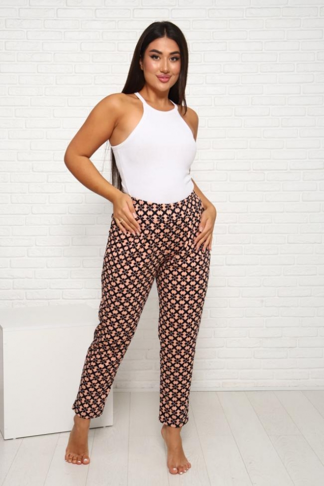 Брюки чиносы женские, выполнены из трикотажного полотна кулирка. Брюки слегка заужены к низу, по бокам брюк выполнены карманы.