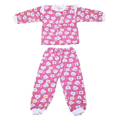 Комплект ясельный для девочки. Кофточка с застежкой на пуговицы, горловина и низ рукавов на манжете. Плечевые швы украшены небольшими крылышками контрастного цвета. Штанишки на внутренней резинке, низ на манжете.