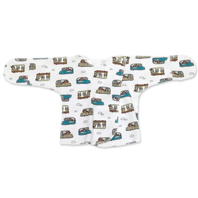 Комплект для мальчика из 3 предметов, с принтом "зверята на машинках": кофточка, ползунки, шапочка из х/б трикотажа. Кофточка с запахом. Застежка кнопка на плечике, снаружи с левой стороны. Закрытый рукав-реглан с рукавичкой-антицарапкой. Наружные швы.