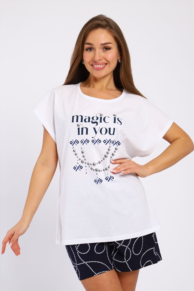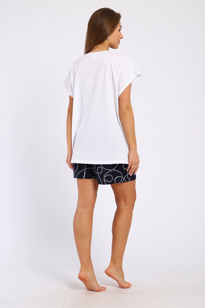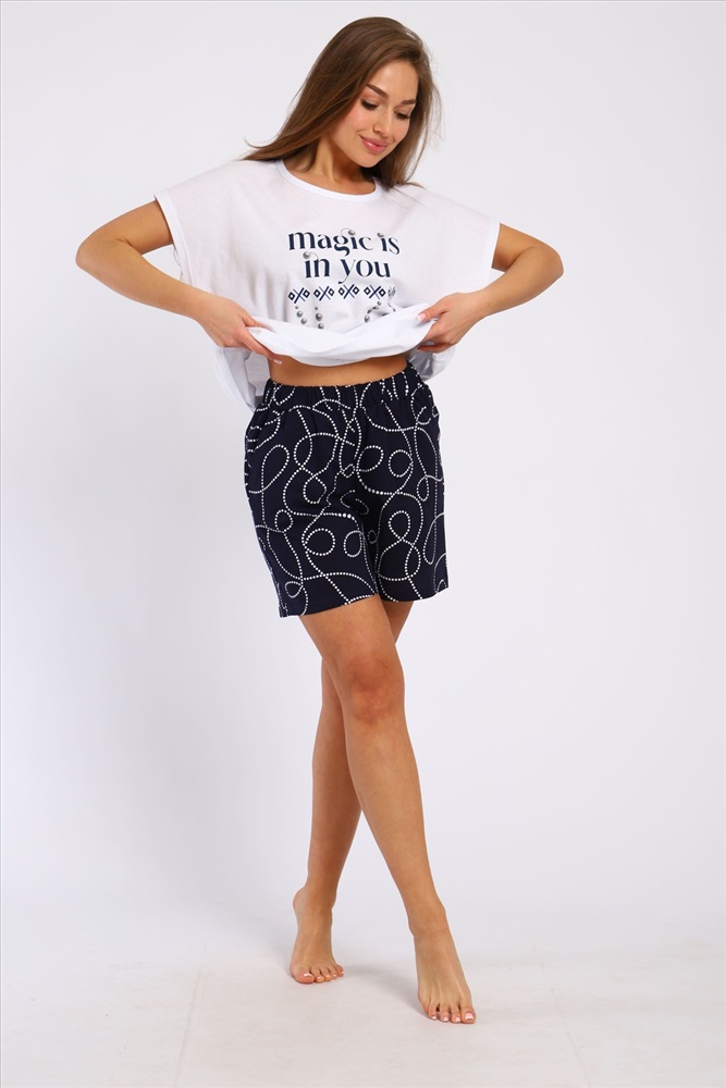 Костюм с шортами выполнен из трикотажного полотна кулирка. Костюм состоит из футболки и шорт. Футболка свободного силуэта, спущенное плечо, углубленная пройма, горловина окантована, на полочке выполнена печать. Шорты с притачным поясом на резинке, карманы в боковых швах.