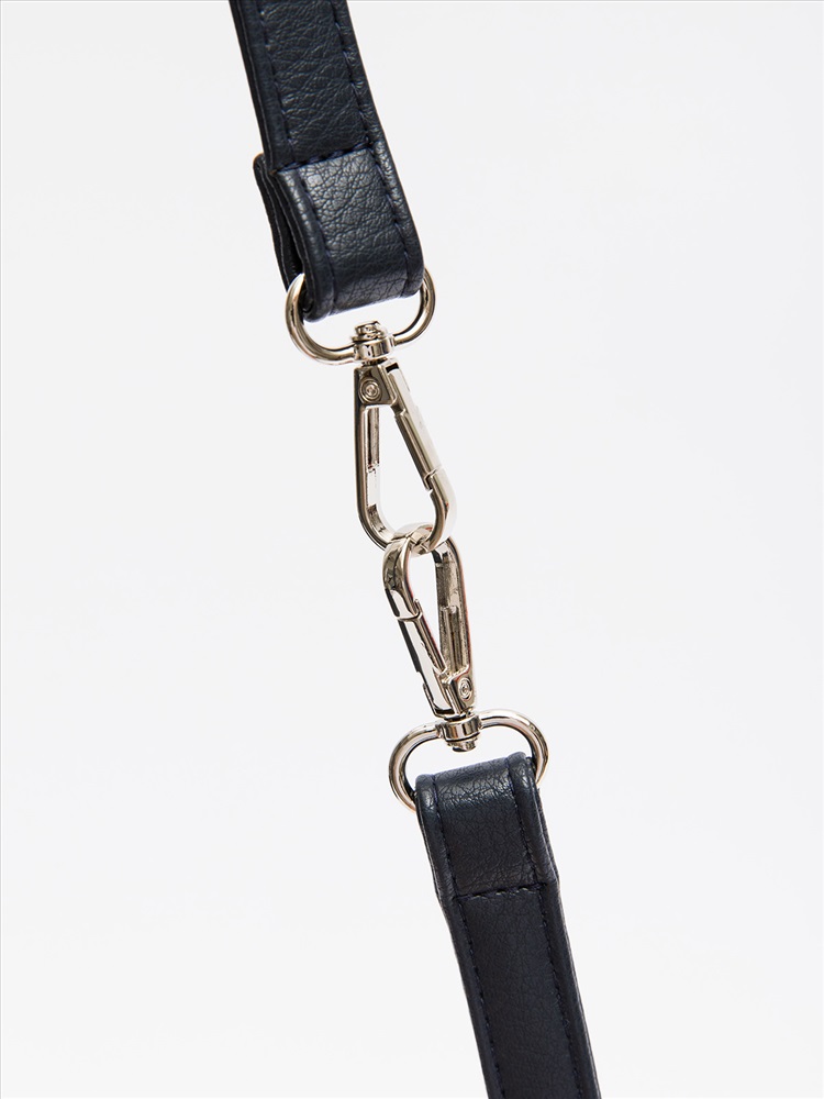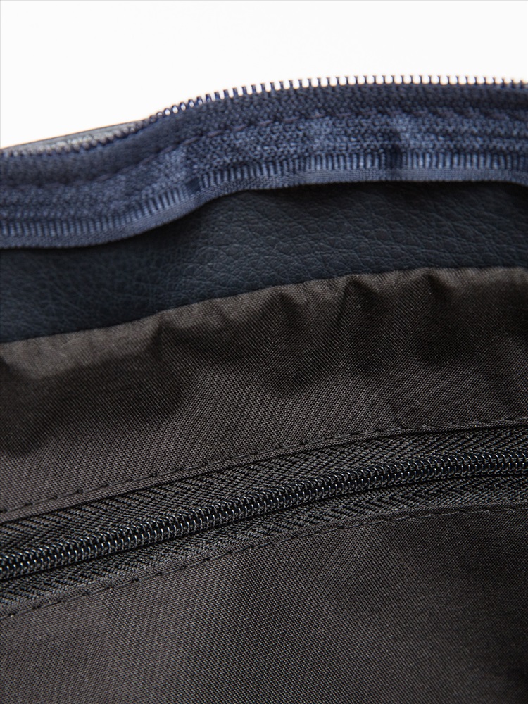 Трапециевидная форма с фигурным подрезом и разрезной передней деталью создает строгий, но выразительный силуэт. Центральный вход на молнии и продуманная внутренняя организация — перегородка с молнией и два стандартных кармана — позволяют удобно разместить все необходимое.