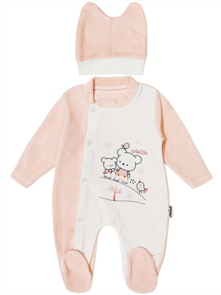 Доп. параметр: Длинный рукав Страна: Турция Материал: Велюр Описание и замерыНабор комбинезон и шапочка выполнен из мягкого велюрового материала. Полочка украшена принтом "Снежное настроение". Горловина на манжете из основного полотна. Застёжка кнопки по всей длине. Втачной рукав, низ обработан швом вподгибку двойной строчкой. Модель с закрытыми носочками, швами вовнутрь. Шапочка на манжете из основного полотна. Верх шапочки выполнен в виде ушек.Размер 62: длина - 45 см, обхват груди - 46 см, длина рукава - 20 см. Шапочка: обхват головы - 27 см. Размер 68: длина - 47 см, обхват груди - 47 см, длина рукава - 22 см. Шапочка: обхват головы - 27 см. Замеры выборочные, могут незначительно отличаться. Комментарии к товару