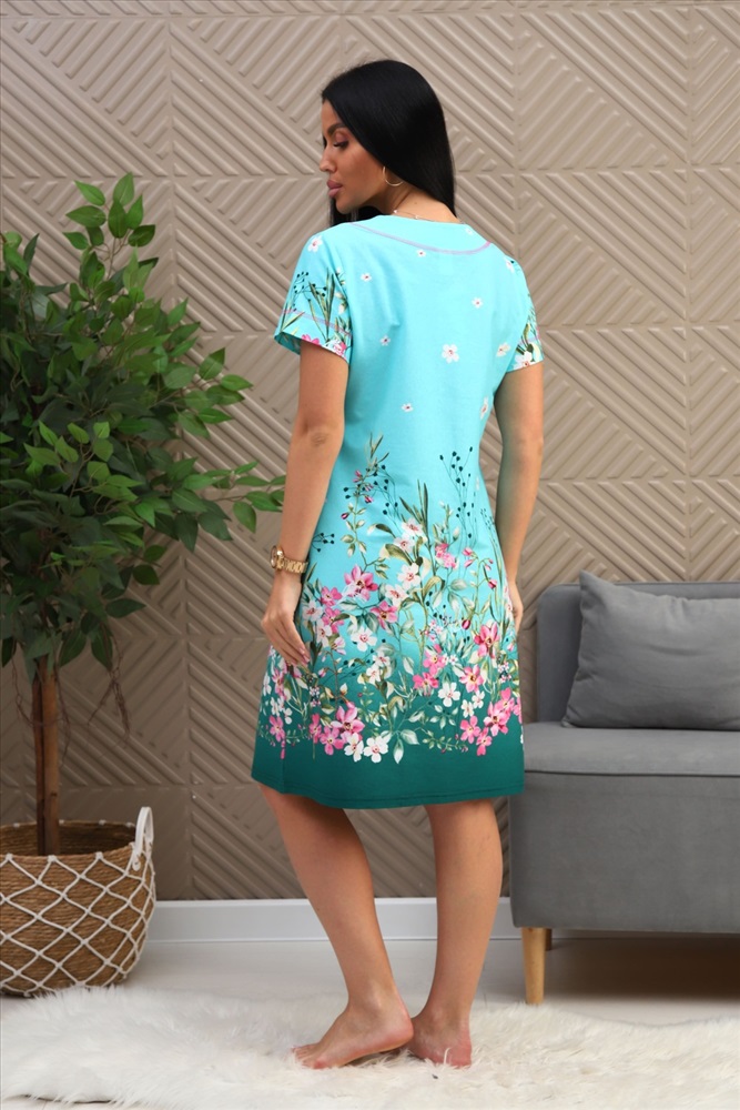 Халат женский из трикотажа. Хлопок 100%. Силуэт полуприлегающий, чуть расклешённый к низу. Горловина круглой формы. Рукав короткий. Низ изделия прямой. В боковых швах карманы. Застежка потайная, на тесьму молнию. Отделкой служит строчка контрастного цвета, в цвет обтяжной пуговицы.
