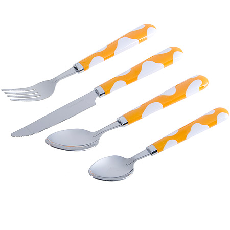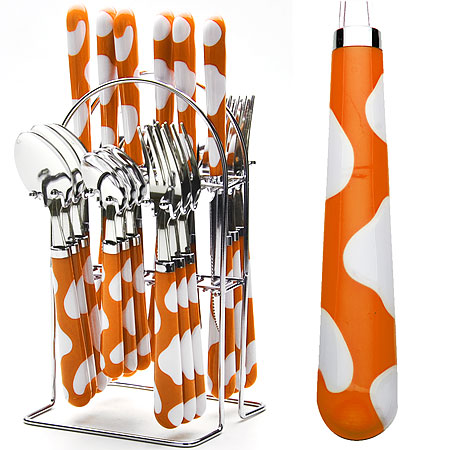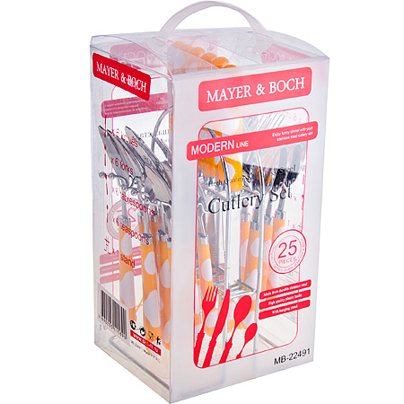 Набор столовых приборов MAYER&BOCH на 6 персон выполнен из прочной нержавеющей стали и цветного пластика. В набор входит 25 предметов: 6 столовых ножей, 6 столовых ложек, 6 столовых вилок и 6 чайных ложек и металлическая подставка. Приборы имеют удобные эргономичные пластиковые ручки. Прекрасное сочетание свежего дизайна и удобство использования предметов набора придется по душе каждому. Предметы набора расположены на подставке с секциями для каждого вида приборов. Набор столовых приборов подойдет для сервировки стола, как дома, так и на даче и всегда будет важной частью трапезы, а также станет замечательным подарком. Подходит для мытья в посудомоечной машине.