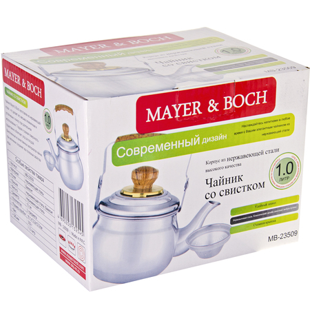Заварочный чайник с металлическим фильтром/ситечком. Изготовлен из высококачественной нержавеющей стали с глянцевой полировкой. Изделия из нержавеющей стали не окисляются и не впитывают запахи, благодаря чему вы всегда получите натуральный, насыщенный вкус и аромат напитков. Сетчатый металлический фильтр гарантирует прозрачность и чистоту напитка от чайных листьев, при этом сохранив букет и насыщенность чая. Эргономичная, стилизованная под дерево, ручка из бакелита не нагревается, что делает использование чайника очень удобным и безопасным. Кроме того, чайник снабжен устройством для открывания носика, а также насадкой-свистком, что позволяет контролировать процесс заваривания. Эстетичный и функциональный, чайник Mayer&Boch будет прекрасно смотреться в любом интерьере. Подходит для использования на всех видах плит, в том числе индукционных. Подходит для мытья в посудомоечной машине.