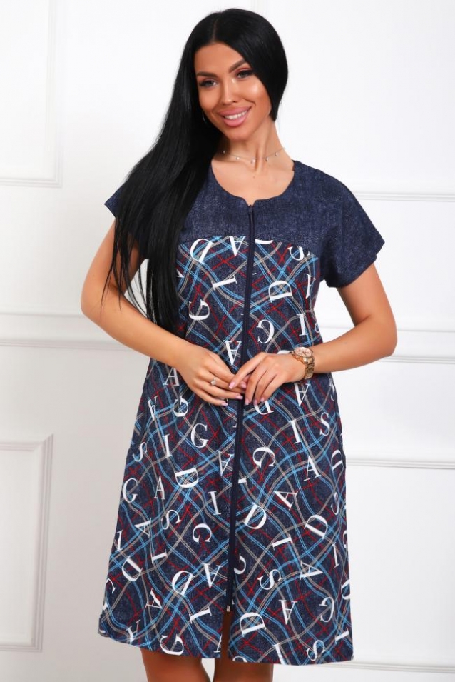 Халат женский из трикотажа. Полуприлегающего силуэта, чуть расклешенный к низу. На полочках и спинке кокетки. Застежка тесьма молния. В боковых швах выполнены карманы. Низ изделия прямой.