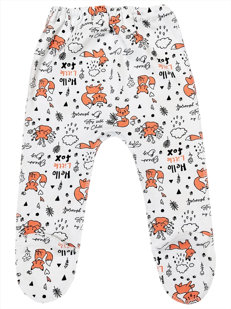 Ползунки прямого кроя, с ластовицей. Выполнены из х/б трикотажа интерлок. Декорированы красочным принтом "Лисята" по всей длине изделия. В поясе на закрытой резинке. У размера 50 модель штанишек без ластовицы. Наружные швы у всех размеров, кроме размера 74.