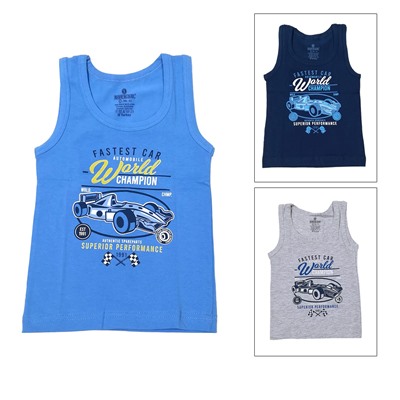 Майка для мальчика с красочным принтом "гонки" на груди. Горловина и проймы отделаны трикотажным кантом.