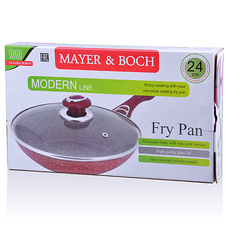 Сковорода с мраморной крошкой MAYER&BOCH выполнена из качественного литого алюминия и снабжена антипригарным покрытием особой прочности. Покрытие антипригарное жаропрочное, защищает сковороду от царапин, является экологически чистым и полностью безопасным, без вредных соединений и примесей. За счет того, что пища не пригорает и не пристает к покрытию сковороды, ее легко и быстро мыть. Прочное индукционное дно сковороды устойчиво к повреждениям и деформации. Эргономичная ручка из бакелита не нагревается и не скользит. Такая сковорода является незаменимой для жарки и тушения различных блюд. Крышка – термостойкое стекло. Подходит для использования на всех типах плит. Подходит для мытья в посудомоечной машине.