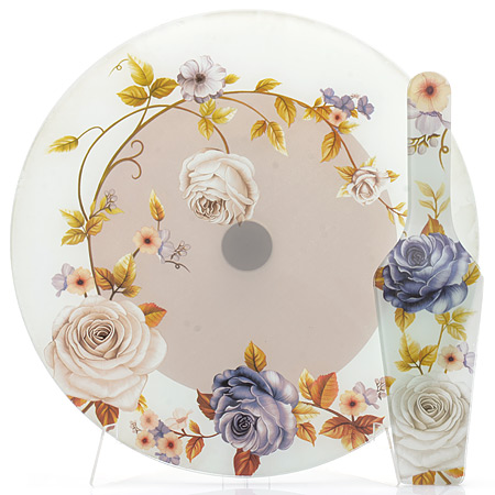 Набор для торта LORAINE из высококачественного стекла с декоративным покрытием включает в себя 1 большое круглое блюдо и 1 лопатку для торта. Изделия декорированы рисунком на красочном фоне и сочетают в себе изысканный дизайн с максимальной функциональностью. Оригинальность оформления набора придется по вкусу и ценителям классики, и тем, кто предпочитает сочные цвета и изящность. Такой набор послужит отличным подарком к любому празднику, а также добавит элегантности и уюта любому праздничному столу! Посуда обладает гладкой непористой поверхностью и не впитывает запахи, ее легко и просто мыть. Набор для торта упакован в стильную подарочную картонную коробку. Подходит для мытья в посудомоечной машине.