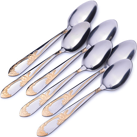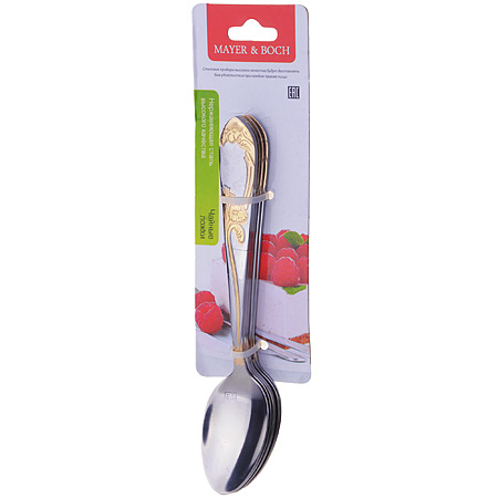 Набор из 6-ти чайных ложек MAYER&BOCH выполнен из высококачественной нержавеющей стали, которая проходит тщательный технический контроль. Качественная полировка обеспечивает высокую степень гигиеничности приборов. Приборы из нержавеющей стали отличаются высокими антикоррозионными свойствами и значительной устойчивостью к воздействию кислот и щелочей. Такая сталь не изменяет вкус и цвет пищи, не выделяет вредных веществ. Ручки ложек украшены элегантным золотым узором, выполненным по технологии плазменного напыления и обеспечивающим высокую износостойкость покрытия. Красивый и элегантный набор чайных ложек MAYER&BOCH станет настоящим украшением любого праздничного или обеденного стола, а эстетичность столовых приборов удовлетворит запросы даже самых требовательных и взыскательных покупателей. Подходит для мытья в посудомоечной машине.