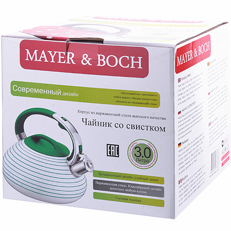 Чайник MAYER&BOCH изготовлен из высококачественной нержавеющей стали. Изделия из нержавеющей стали не окисляются и не впитывают запахи, благодаря чему вы всегда получите натуральный, насыщенный вкус и аромат напитков. Эргономичная фиксированная ручка выполнена из нержавеющей стали и пластика. Носик чайника оснащен насадкой-свистком, который позволяет контролировать процесс кипячения или подогрева воды. Поверхность чайника гладкая, что облегчает уход за ним. Эстетичный и функциональный, с современным дизайном, чайник будет оригинально смотреться на любой кухне. Подходит для использования на всех типах плит, кроме индукционных. Подходит для мытья в посудомоечной машине.