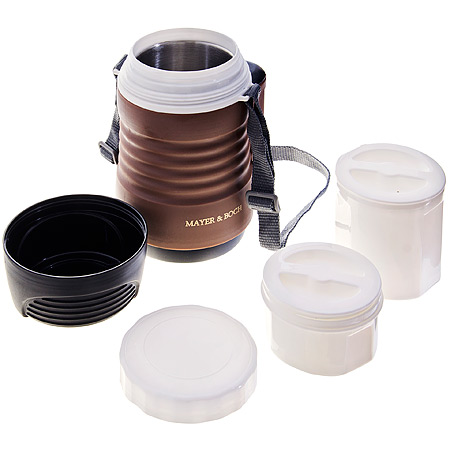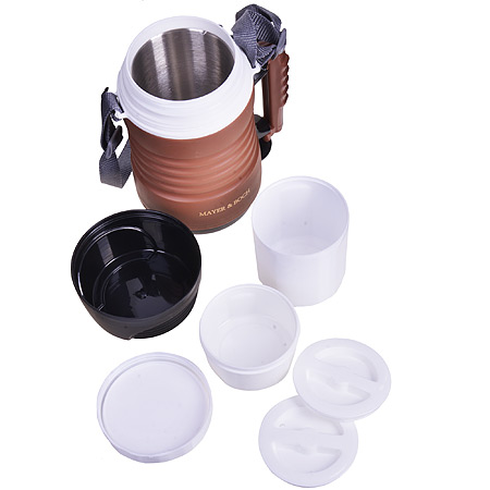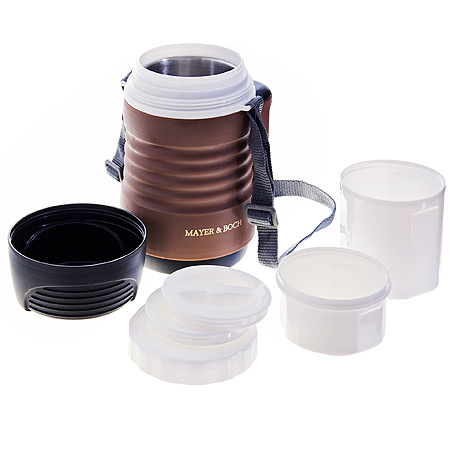 Пищевой термос MAYER&BOCH станет прекрасным дополнением к набору ваших кухонных принадлежностей. Термос предназначен для длительного хранения горячих блюд, сохраняя нужную температуру до 5-ти часов. Цветной корпус выполнен из пищевого пластика. Внутренний резервуар из высококачественной нержавеющей стали, не вступающей в реакцию с продуктами и не искажающей вкус приготовленных блюд. В широкое горлышко термоса помещены два контейнера с крышками, изготовленные из пищевого пластика белого цвета. Крышки легко открываются и плотно закрываются с помощью легкого щелчка. Это идеальный вариант для переноски нескольких разных блюд. Данный термос обладает не только прекрасными термоизоляционными качествами, но и непревзойденной надежностью. Благодаря ремню для переноски, его легко и удобно транспортировать. В комплекте: термос, крышка, 2 контейнера с крышками.