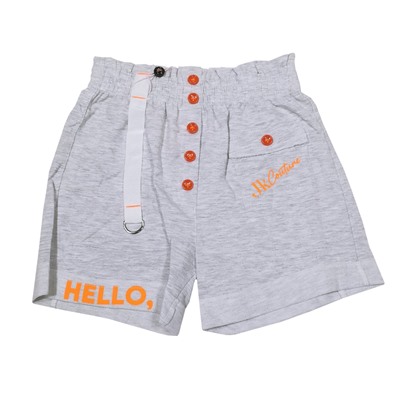 Шорты для девочки, из х/б трикотажа. В поясе на широкой, закрытой резинке. К поясу пришита в виде шлевки смесовая лента с металлическим полукольцом. Имитация ширинки с пуговицами. Один накладной карман с клапаном, пуговицей и надписью. Снизу штанины с подворотом на лицевую сторону. Крупная надпись на одной штанине спереди, на другой сзади.