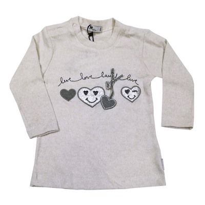 Джемпер для девочек из мягкого трикотажа с начесом с правой стороны. Полуприталенный силуэт. Застежка кнопки на правом плече. Полочка украшена аппликацией сердце из блестящей ткани и бархатным бантиком с сердечком.