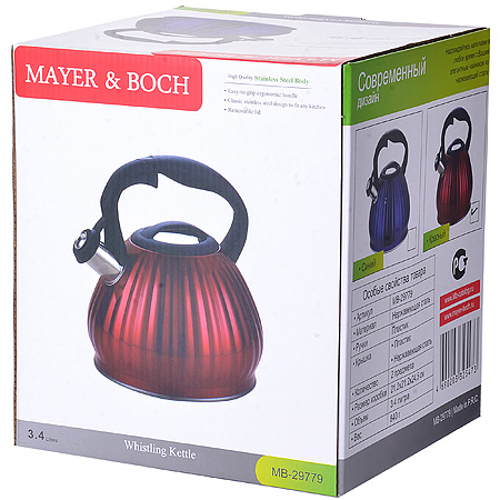 Чайник со свистком 3,4 литра MAYER&BOCH из нержавеющей стали - это идеальное решение для вашей кухни. Его высокое качество обеспечивает надежность и долговечность. Благодаря своей функциональности и эстетичному дизайну, он станет неотъемлемой частью вашего быта. Свисток на носике контролирует процесс кипячения, а широкое дно равномерно распределяет тепло. Эргономичная ручка из термостойкого пластика обеспечивает удобство использования. На ручке расположена маленькая кнопка для удобного открывания носика. Наслаждайтесь натуральным вкусом и ароматом напитков с посудой MAYER&BOCH каждый день. Фактический объем данного товара 3,4 литра, рекомендуем использовать рабочий объем, составляющий 3 литра. Чайник из нержавеющей стали MAYER&BOCH объемом 3 литра станет незаменимым помощником на вашей кухне. Изделие не только обладает превосходными техническими характеристиками, но и отличается стильным дизайном. Чайник из нержавейки не подвержен коррозии и не впитывает запахи, что позволяет сохранять насыщенный вкус и аромат вашего любимого напитка. Чайник со свистком для газовой плиты из нержавейки 3 л идеально подходит для быстрого и равномерного нагрева воды. Свисток на носике сигнализирует о готовности воды, что позволяет вам контролировать процесс кипячения. Чайник для плиты 3 л нержавейка со свистком - это универсальный выбор для любой кухни. Он подходит для использования на всех типах плит, включая индукционные. Для содержания в идеальном состоянии, можно мыть в посудомоечной машине. Эта посуда сочетает в себе функциональность, качество и стиль, делая процесс приготовления чая максимально удобным и приятным. Элегантный дизайн и красивое оформление позволит сделать его отличным подарком на любой праздник.