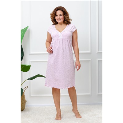 Сорочка женская из кулирного полотна, состав 100% хлопок. Горловина сорочки с отделкой из кружева, рукава обработаны окантовкой, низ сорочки обработан декоративной строчкой. Легкая в уходе.