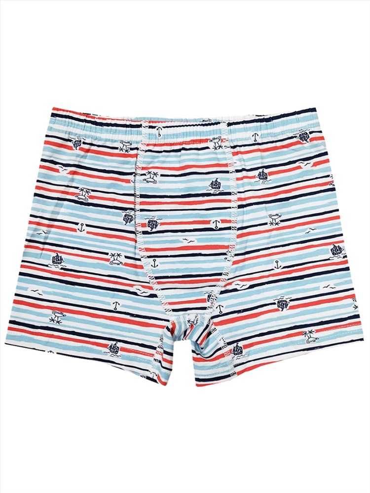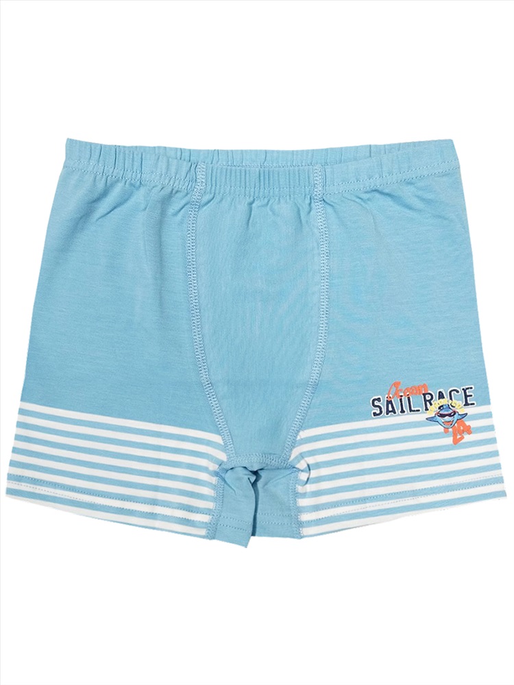 Трусы боксеры для мальчиков. Плотный и приятный к телу хлопковый трикотаж, довольно эластичный, удобен в носке. Данная модель имеет мягкую комфортную резинку в поясе, которая обеспечивает классическую посадку на талии. На изделие нанесен принт в морской тематике. На передней части - гульфик. Низ изделия с подгибом, обработан двойной строчкой.