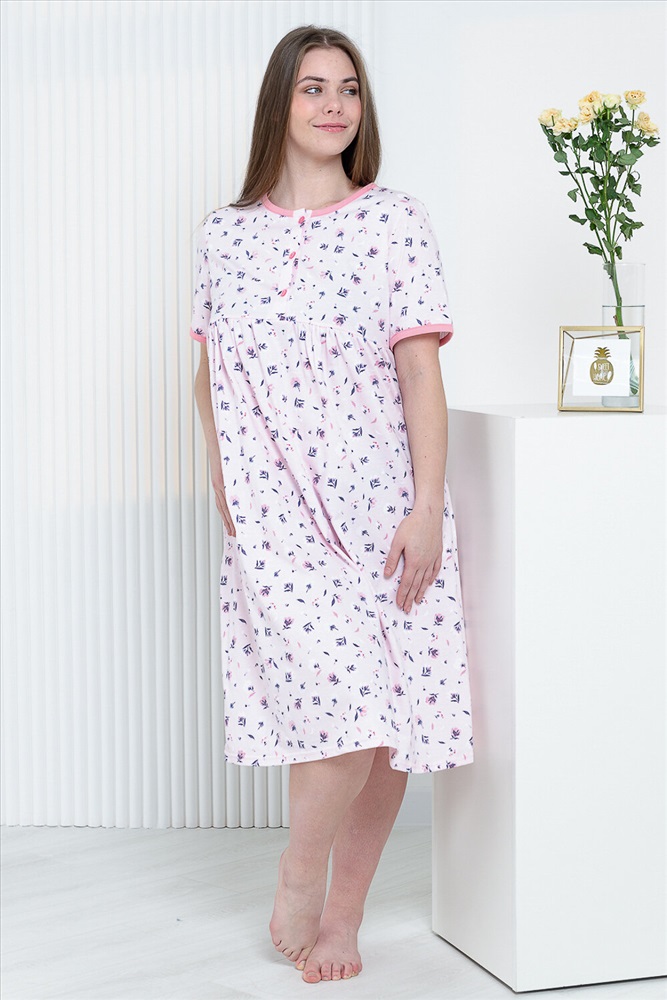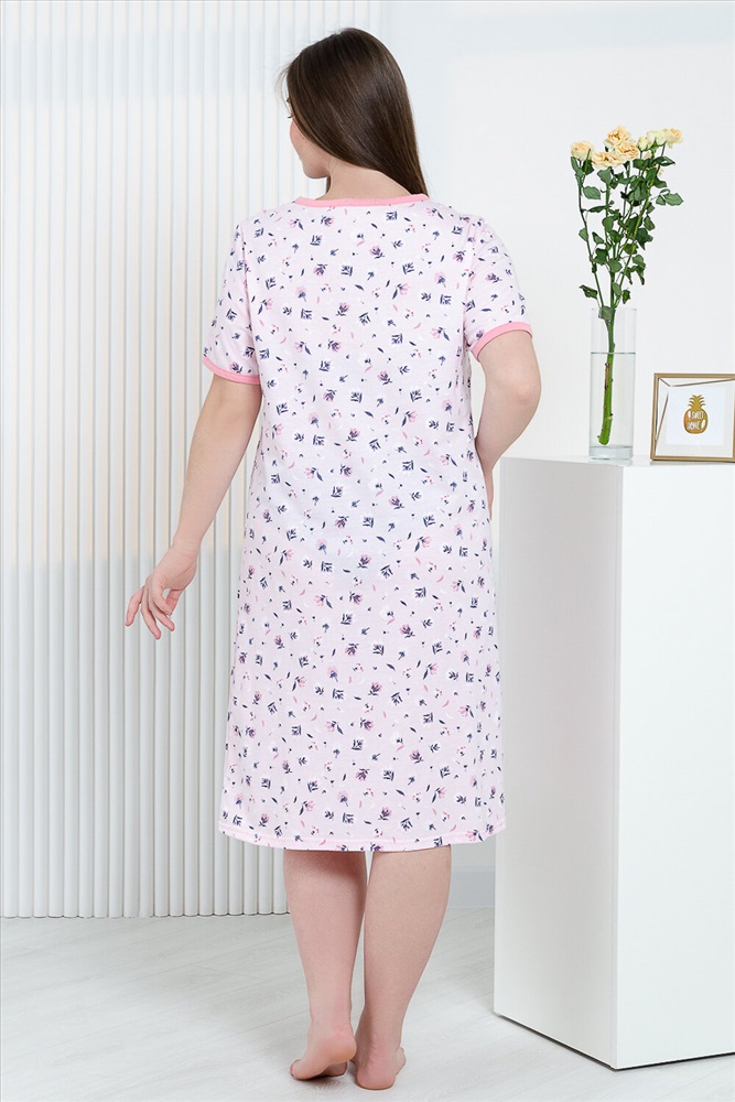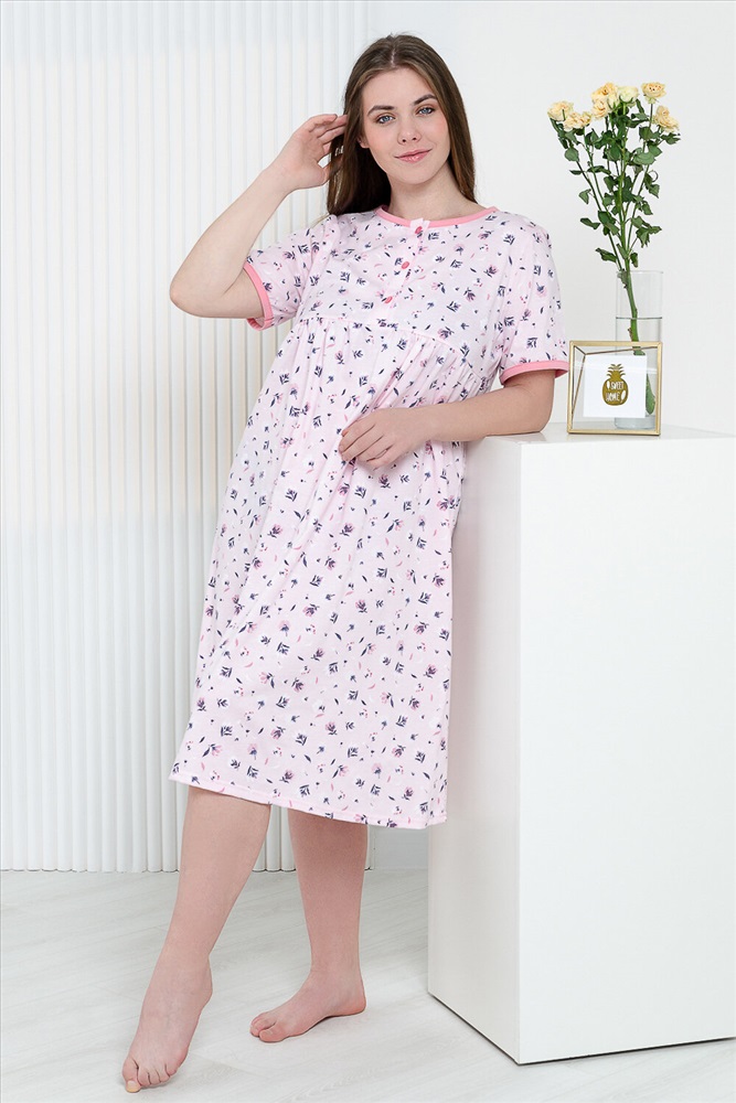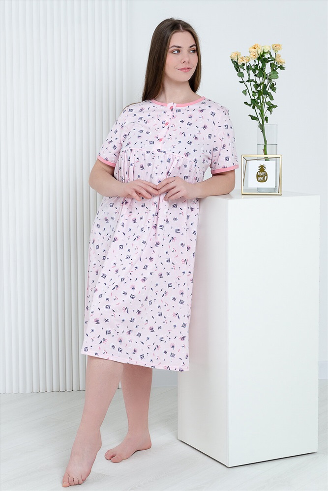 Сорочка женская из кулирного полотна, 100% хлопок. Сорочка свободного кроя, горловина круглая, обработана окантовкой, на кокетке прорезная планка на пуговицах, рукава обработаны окантовкой, низ сорочки подогнут на плоскошовной машине. Эта сорочка идеальна для сна, не сковывает движений. Легкая в уходе.