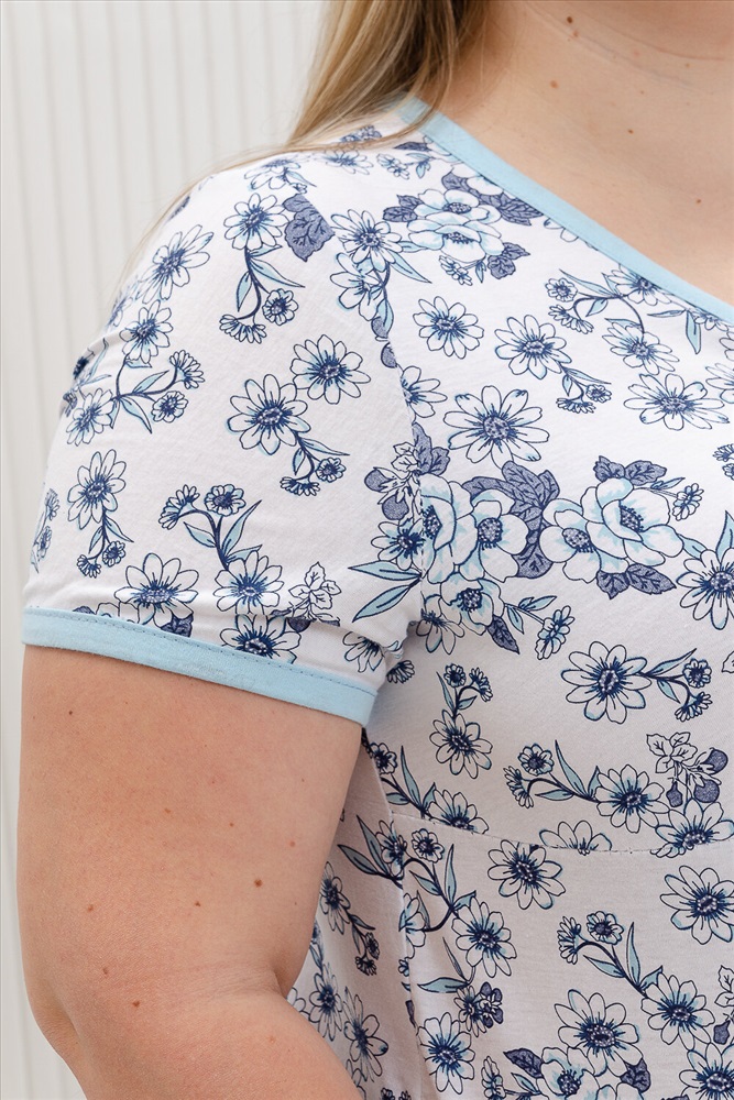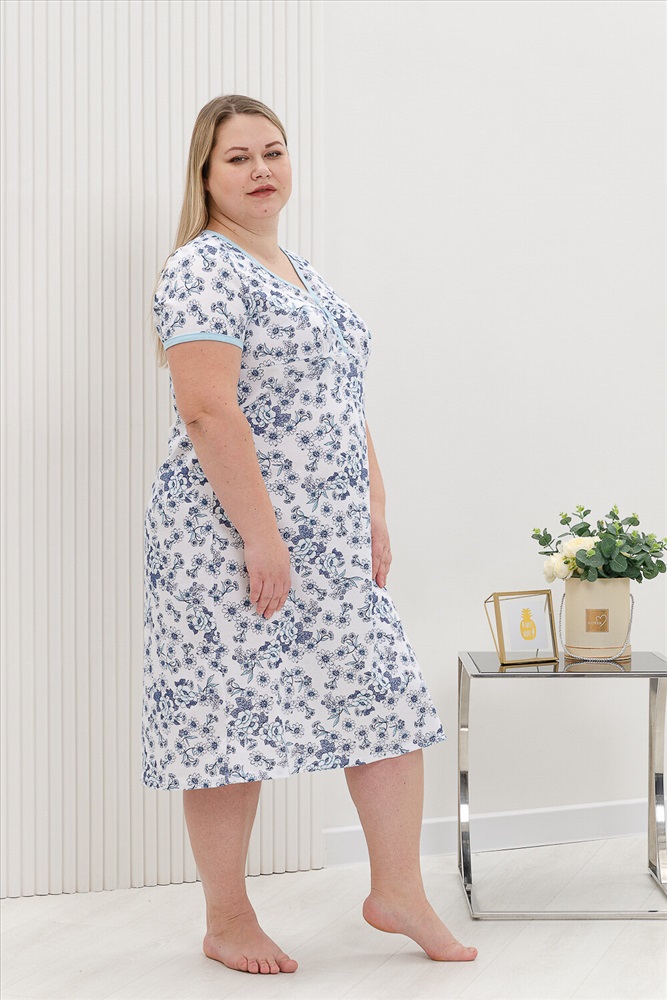 Сорочка женская из кулирного полотна, 100% хлопок. На полочке разрезная кокетка, горловина обработана окантовкой, на планке декоративные пуговицы, низ рукавов окантован, низ изделия обработан на плоскошовной машине. Сорочка удобна и комфортна для сна. Легкая в уходе.