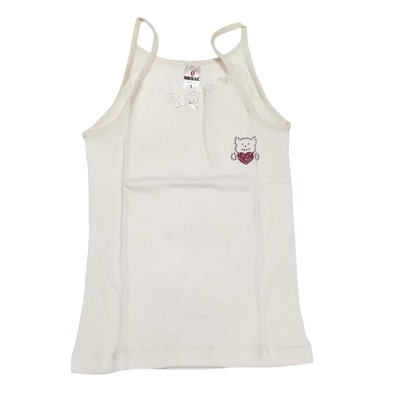 Маечка для девочки, х/б трикотажа. Полуприлегающий силуэт. Тонките бретели из эластичного трикотажа, Вырез отделан эластичным трикотажным кружевом. Украшена аталасным бантиком и аппликацией из страз и блесток. Комментарии к товару