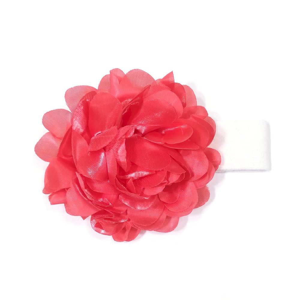 Повязка на голову для девочки из эластичного трикотажа, украшена пышным цветком из ткани с перламутровым блеском.
