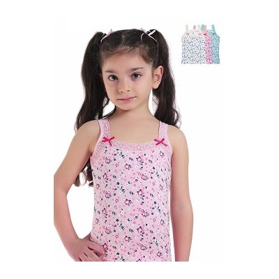Майка для девочки, из эластичного трикотажа с цветочным принтом. Полуприлегающий силуэт. Вырез украшен эластичным кружевом. Широкие бретели из эластичного кружева, отделаны трикотажным кантом и украшены атласными бантиками.