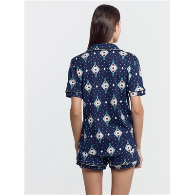 Хлопковый женский комплект актуального свободного силуэта. Рубашка прямая, с отложным воротником и лацканами, короткими рукавами, застегивается на пуговицы. Дополняют ее свободные шорты длины мини, с резиновой тесьмой в поясе и атласной тесьмой, которая завязывается на бантик. Особенность модели – контрастные канты на рукавах, воротнике и передней части рубашки. Рекомендуем для сна, отдыха и домашних дел!