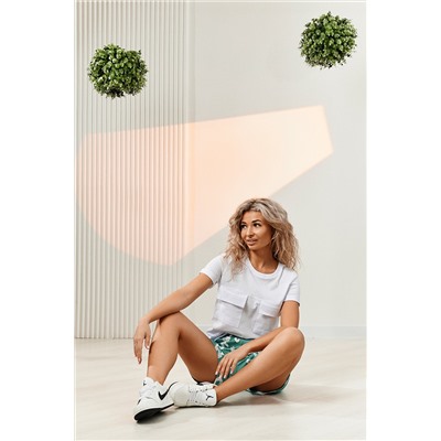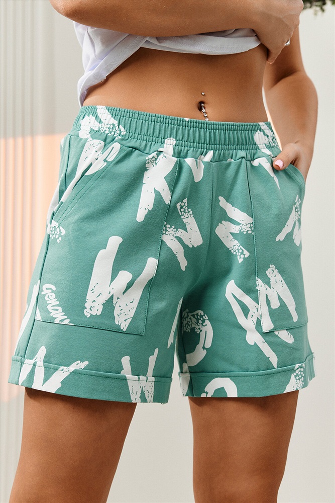 Футболка прямого силуэта, с округлой горловиной, длиной до середины бедра. Рукав втачной, короткий, с отворотом. На полочке расположены накладные карманы с клапаном. Горловина обработана обтачкой из эластичного полотна. Шорты прямые, свободные, на поясе, с боковыми накладными карманами, с манжетами.
