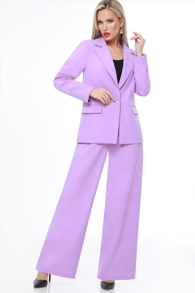 Брючный деловой костюм — элегантная модель на все времена, которая будет роскошно смотреться как на работе, так и на вечернем мероприятии. Жакет прямого кроя с застежкой на пуговицу не только соответствует последним модным тенденциям, но и помогает сгладить нюансы фигуры. Два кармана с клапанами по бокам функциональны и не добавляют лишнего объема. Стильным дополнением к жакету становятся широкие прямые брюки полной длины с высокой посадкой. Модель не сковывает движений, визуально вытягивает силуэт и создает эффект летящей походки. При желании брюки можно дополнить кожаным ремешком, чтобы подчеркнуть талию и стильно завершить образ. Комплект выполнен из качественной приятной к телу костюмной ткани с подкладом, которая практически не мнется и слегка тянется. Рекомендуется стирать изделие в деликатном режиме при температуре до 30 градусов без отжима.