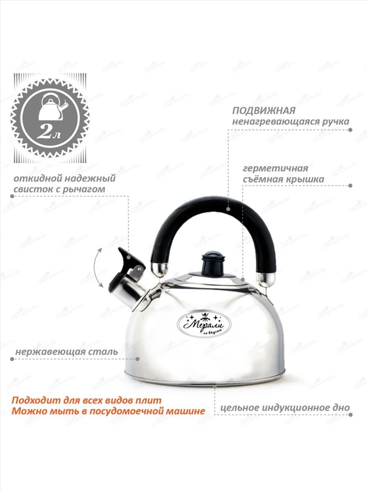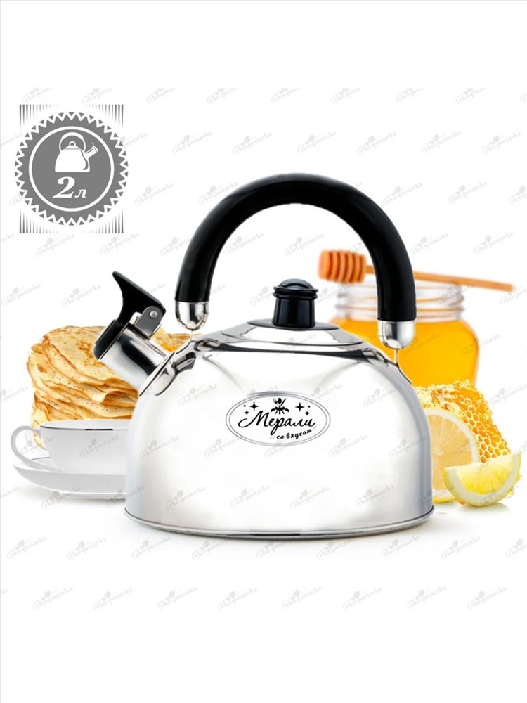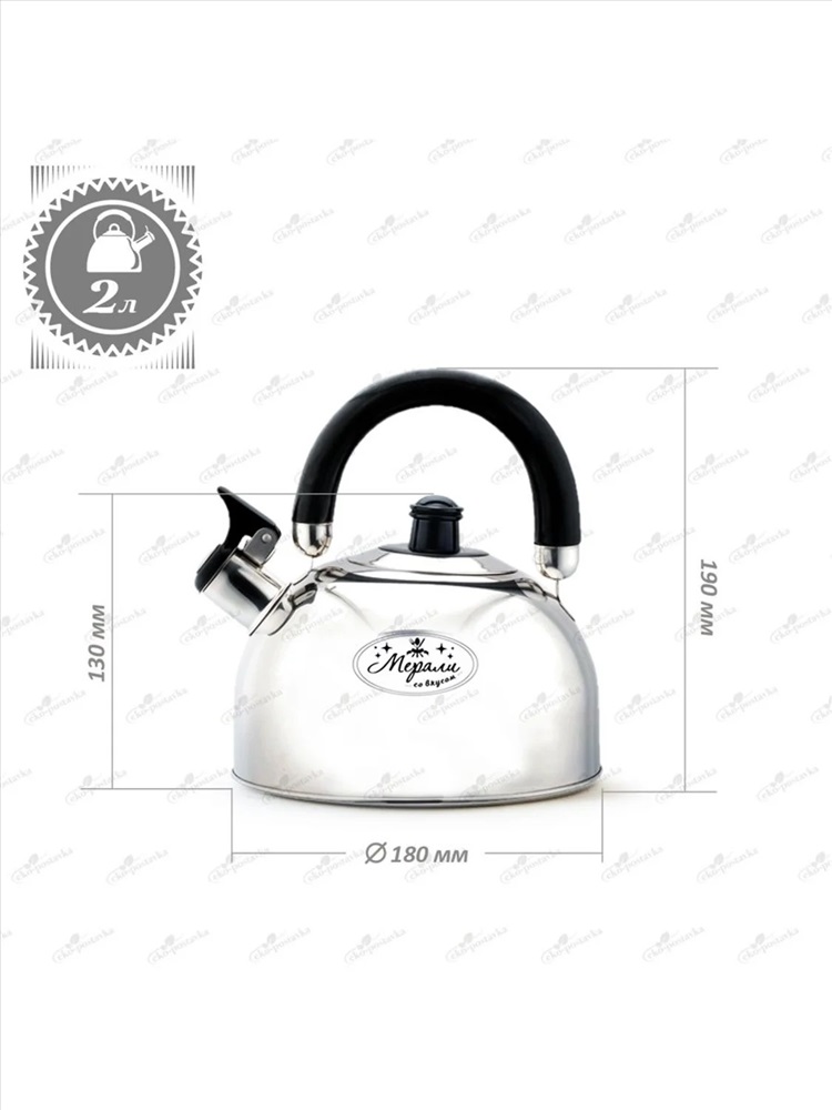 Чайник со свистком из нержавеющей стали 2 литра - идеальное решение для вас. Высота составляет 19 см, диаметр дна 18 см. Имеет бакелитовую ручку с прорезиненным покрытием. Эргономичная комбинированная подвижная ручка с покрытием "soft-touch". Чайник для плиты имеет удобный откидной свисток на крышке носика. Благодаря нержавеющей стали надолго сохранит отменные эксплуатационные характеристики и прекрасный внешний вид. Благодаря трехслойному термоаккумулирующему дну вода в чайнике для индукционной плиты нагревается быстрее и долго остается горячей без дополнительного подогрева. Подходит для всех видов плит, включая индукционную. Еще одним существенным преимуществом является его не нагревающаяся ручка. Ручка остается прохладной на ощупь, даже когда вода закипает, что делает ее безопасной и удобной в использовании. Чайник из нержавеющей стали на плиту станет отличным подарком для себя и своим близким по любому поводу и празднику. Чайник со свистком для газовой плиты продается в подарочной коробке с пластиковой ручкой. Кроме того, он также станет незаменимым помощником на отдыхе. Чайник станет полезным дополнением к вашему активному отдыху, идеально подходящим для кемпингов, пикников, походов, рыбалки. Наша посуда оригинально вписывается в любой кухонный интерьер. Насладитесь вкусным чаепитием со своими близкими с помощью нашего высококачественного чайника из нержавеющей стали. Его гладкий и элегантный дизайн придаст нотку стиля вашей кухне или обстановке на открытом воздухе. Итак, соберите своих друзей и семью и насладитесь восхитительным чаепитием. Идеальный подарок себе и близким по любому празднику и поводу, а также незаменимая вещь на даче и дома! Нельзя нагревать чайник на кухню с объёмом воды менее чем 50% от общего объема и не допускать выхода пламени газовой конфорки за пределы диаметра дна посуды. В нашем магазине вы найдете много посуды для приготовления и инвентарь: заврочные чайники, кастрюли, сковородки, ковши кухонные,наборы ножей, доски и другое.