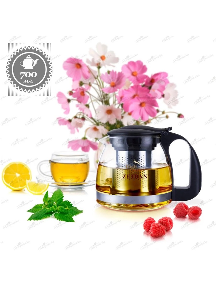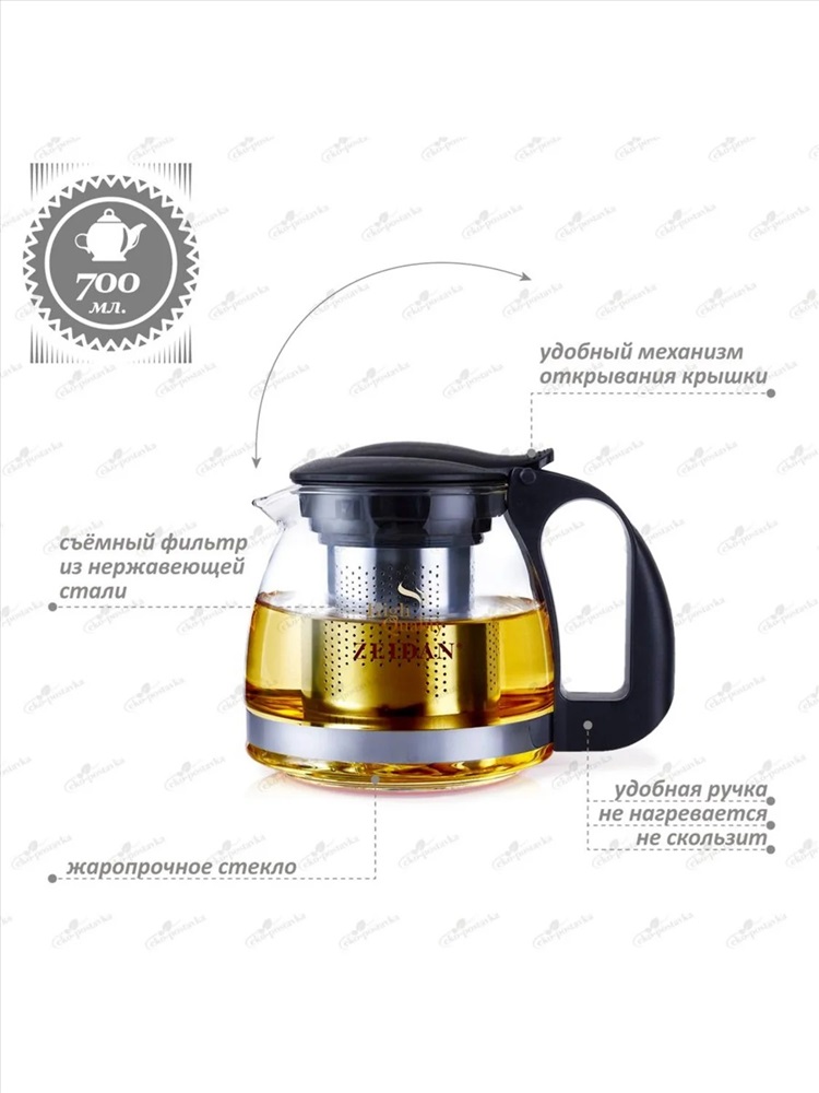 Производитель: ZEIDAN; Артикул поставщика: Z-4242; Год: 2024; Высота упаковки, см: 15; Длина упаковки, см: 25; Ширина упаковки, см: 15 Заварочный чайник 700 мл, чайник из стекла 0,7 литра с фильтром, для заваривания чая и трав с ситом. Заварочный чайник стеклянный объёмом 0,7 л. Чайник заварочный стеклянный с ситечком для заваривания чая, кофе, трав и любых цветочных фруктовых напитков станет вашим любимчиком на кухне! Заварочный чайник бочонок стеклянный изготовлен из высококачественного термостойкого жаропрочного боросиликатного стекла. Преимущества термостойкого стекла в том, что заварник из него получается легким, термостойким, не впитывает запахов, а также не тускнеет даже по прошествии времени. Стеклянная колба удобной и устойчивой формы оснащена дополнительными креплениями в виде стальных колец, что придает изысканный вид стеклянному чайнику. Удобная не нагревающаяся ручка из бакелита защищает руки от ожогов. Удобная легкая крышка чайника для заварки из высококачественного пластика очень удобно открывается и закрывается нажатием одного пальца. Заварник стеклянный со съемным фильтром из нержавеющей стали легко моется, заварочный чайник бочонок. Заварник стеклянный с ситечком обязательно пригодится на кухне и как кофейник, а также станет замечательным и отличным подарком, так как поставляется в компактная подарочной упаковке. Большой чайник в жаркое время можно использовать как кувшин с крышкой для холодных фруктовых и ягодных напитков: залейте любой ягодный напиток в стеклянную колбу, а в фильтр положите кусочки льда - это будет идеальным напитком для вас и ваших друзей и семьи в летние жаркие дни, наслаждайтесь чайной церемонией в любое время! В дополнение для подогрева чайника и напитка можно использовать подставку подогрев со свечой, которую вы так же можете приобрести в нашем магазине. Чайник для заварки понравится как любителям кухни в современном стиле, так и тем, кто предпочитает классику. Эта декоративная посуда прекрасно подойдет для сервировки стола. Соберите коллекцию стеклянной посуды для кухни в нашем магазине!