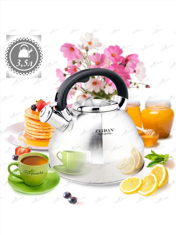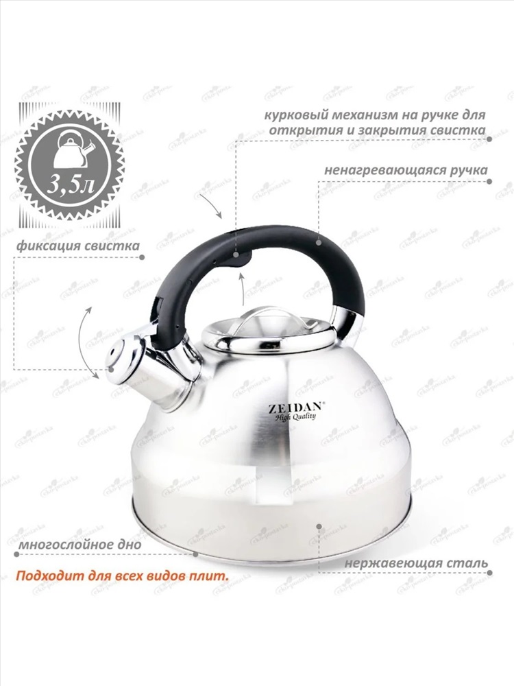 Чайник со свистком из нержавеющей стали 3,5 литра - идеальное решение для вас. Чайник для плиты имеет бакелитовую ручку с прорезиненным покрытием с рычагом для открывания носика. Эргономичная комбинированная фиксированная ручка с покрытием "soft-touch". Имеет удобный курковый механизм. Благодаря нержавеющей стали чайники для плиты со свистком надолго сохранят отменные эксплуатационные характеристики и прекрасный внешний вид. Трехслойное термоаккумулирующее дно в чайнике нагревается быстрее и долго остается горячим без дополнительного подогрева. Чайники со свистком подходят для всех видов плит, включая индукционную. Еще одним существенным преимуществом чайника металлического является его не нагревающаяся ручка. Остается прохладной на ощупь, даже когда вода закипает.