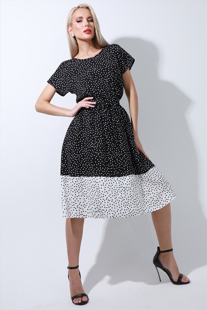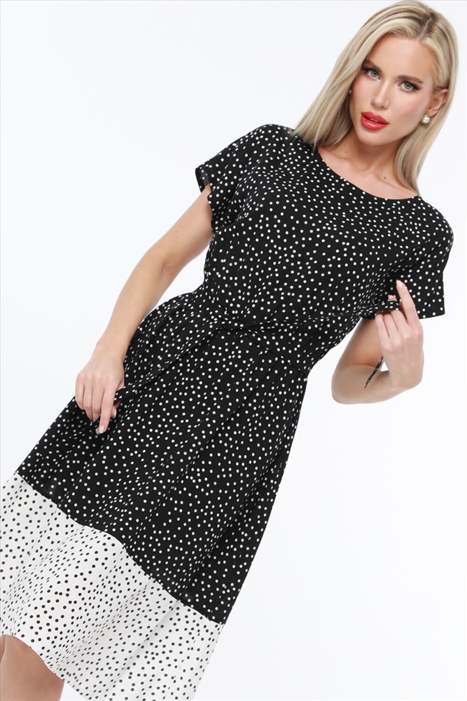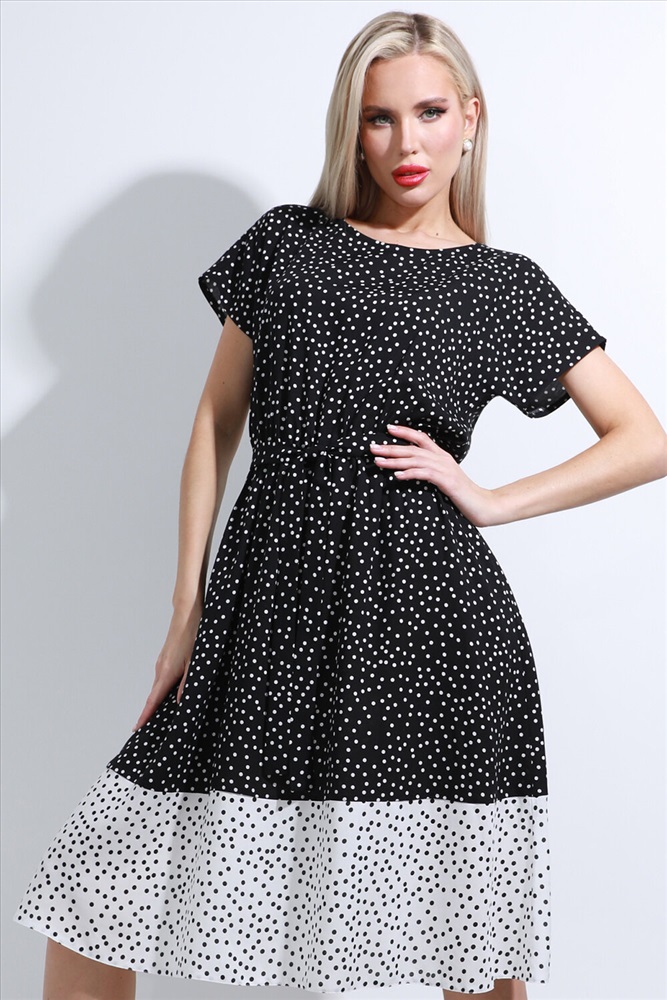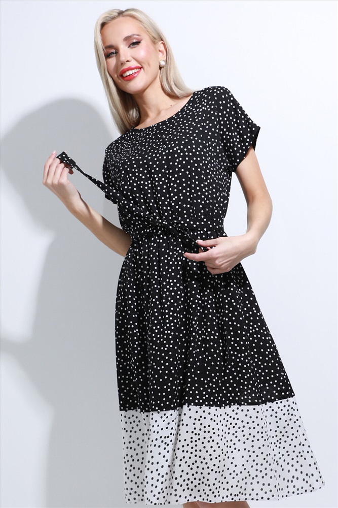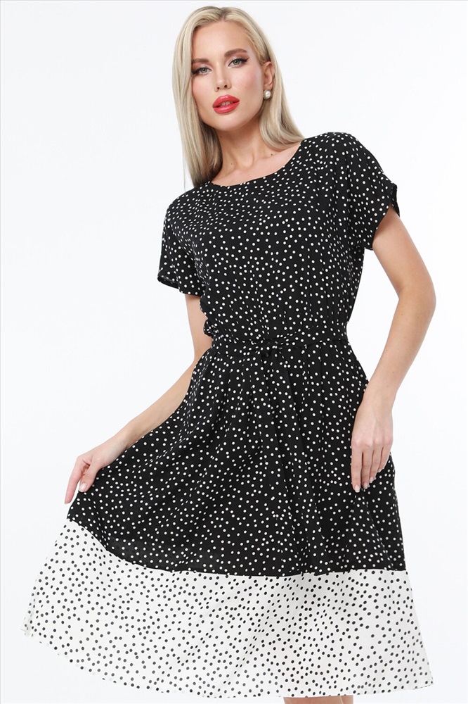 Платье свободного кроя с коротким цельнокроенным рукавом - лучший выбор для гардероба! Волан по низу юбки придает образу романтический настрой, а для большей элегантности пояс платья выполнен из той же ткани, что и волан.