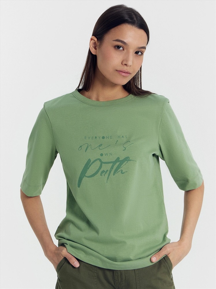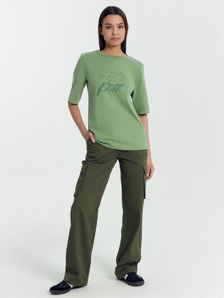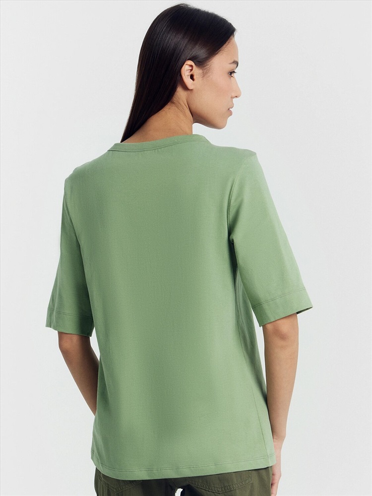 Футболка из трикотажного полотна кулирного переплетения. В составе ткани – только хлопок! Силуэт прямой, длина до середины бедер. Свободные рукава доходят до локтей. Вырез горловины круглый. Отличный выбор!