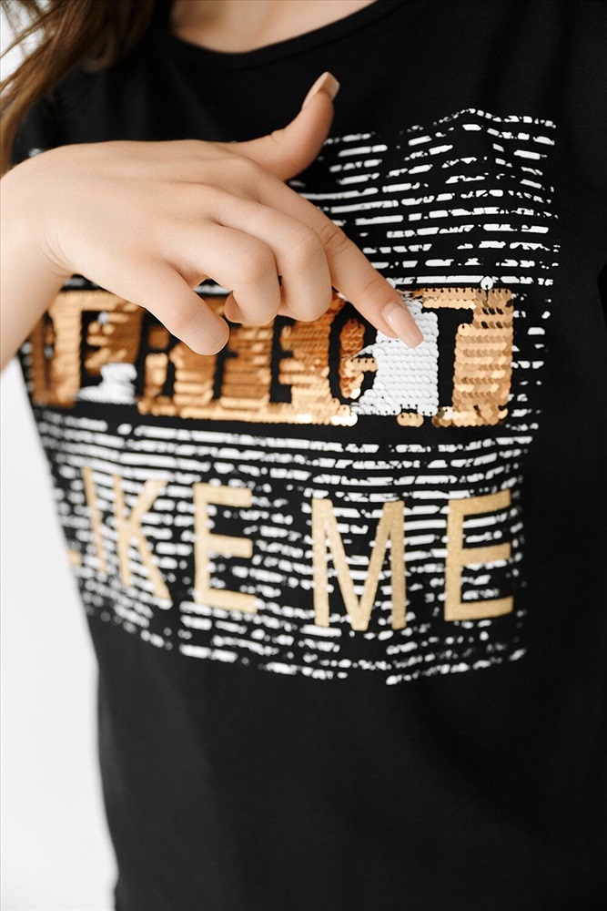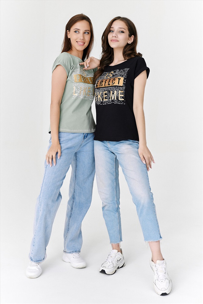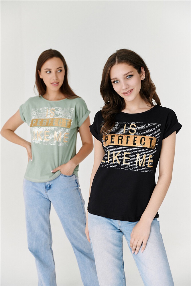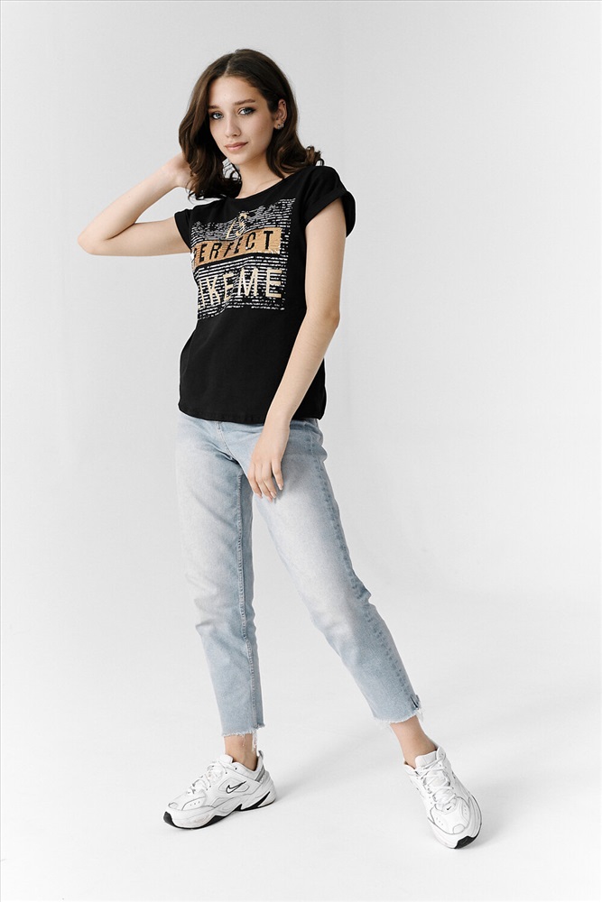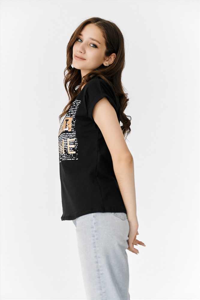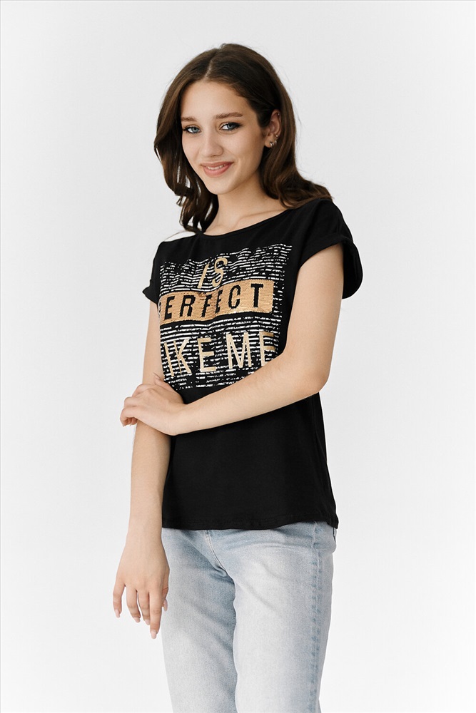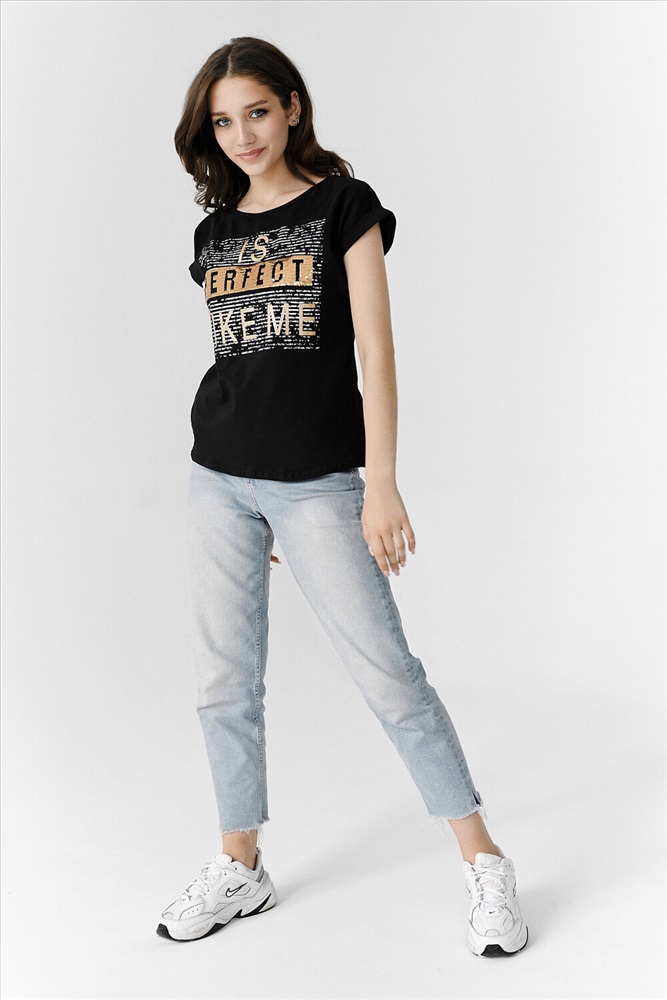 Футболка полуприлегающего силуэта, средней длины, с округлой горловиной. Рукав цельнокроеный, короткий, на манжете с отворотом. Полочка украшена эффектной печатью с пайетками