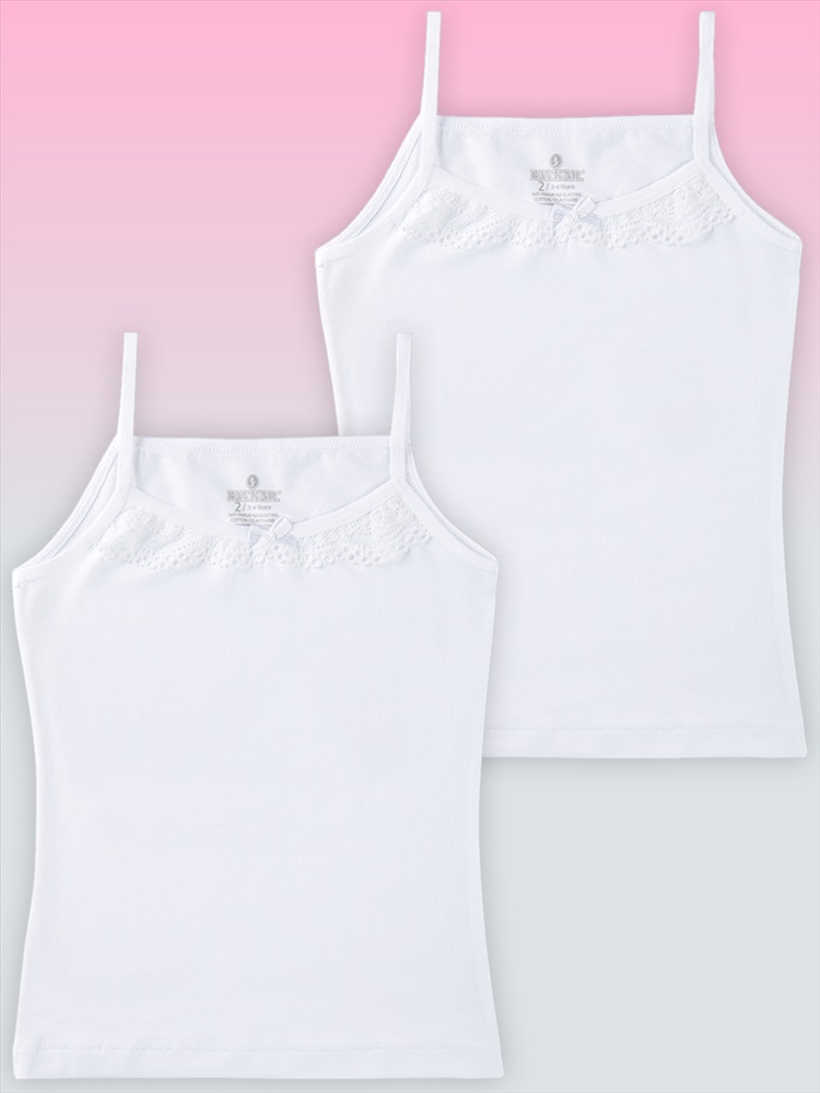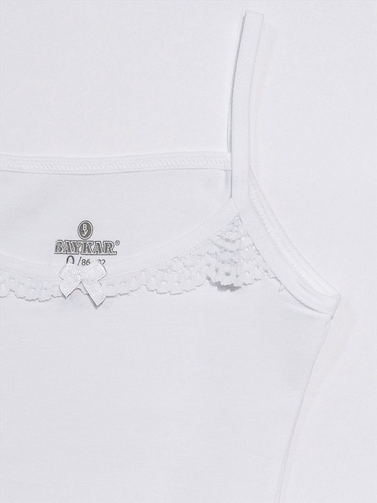 Майка для девочки, на тонких бретелях. Выполнена из эластичного х/б трикотажа кулирное полотно. Модель в белом цвете полуприталенного силуэта. Полукруглый вырез украшен кружевом и атласным бантиком. Вырез, бретели, проймы отделаны эластичным трикотажным кантом. Низ изделия обработан швом вподгибку двойной строчкой.