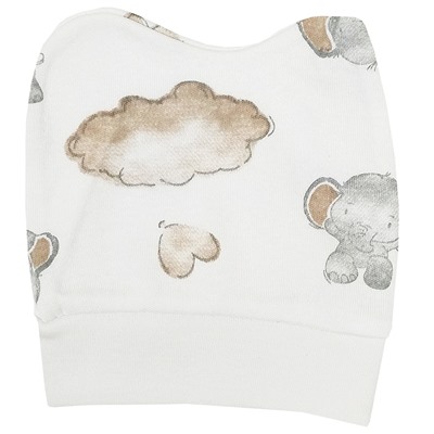 Шапочка с ушками. Низ шапочки на манжете. Шапочка декорирована принтом "Слоники, сердечки, облака".