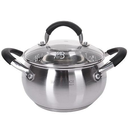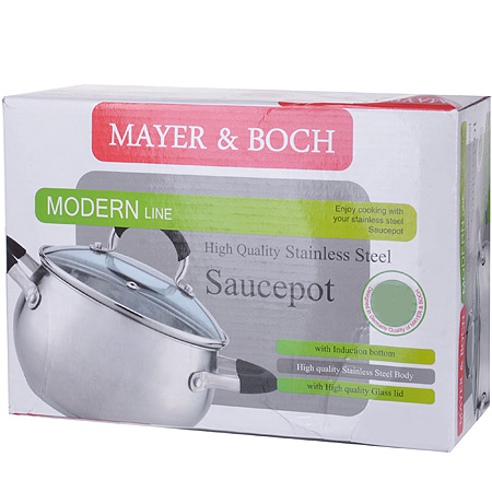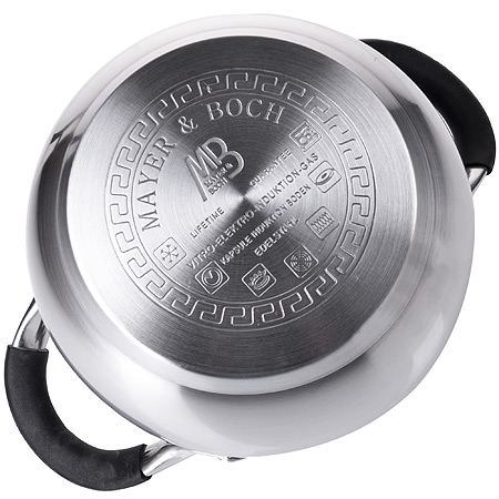 Кастрюля MAYER&BOCH изготовлена из высококачественной нержавеющей стали CrNi 18/10 с матовой внешней поверхностью. Многослойное термоаккумулирующее капсульное дно кастрюли с прослойкой из алюминия обеспечивает наилучшее распределение тепла. Крышка из термостойкого стекла плотно прилегает к краю кастрюли, предотвращая пролив жидкости и сохраняя аромат блюд. Кастрюля оснащена двумя удобными стальными ручками с силиконовыми накладками. Форма кромки кастрюли предотвращает разливание жидкости, а благодаря правильности линий кромки в комбинации с крышкой обеспечивается максимальная герметизация между ними. Кастрюля подходит для всех типов плит, включая индукционные и пригодна для мытья в посудомоечной машине. В комплекте 2 предмета: кастрюля, крышка.