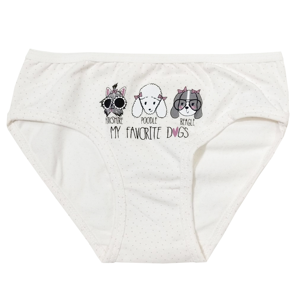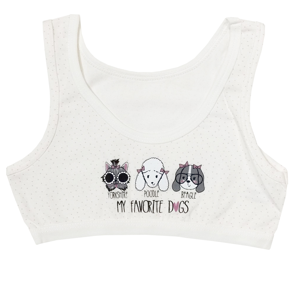 Комплект белья для девочек из х/б трикотажа (кулирное полотно), состоящий из топа и трусиков. Комплект с рисунком "в крапинку", украшен веселым принтом "Мои любимые собачки".
