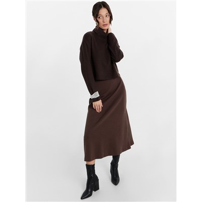 Юбка А-силуэта, длиной миди. Верхний срез обработан швом вподгбку с эластичной тесьмой (внутренняя). На задней детали застрочены вытачки. Нижний срез обработан швом вподгибку.
