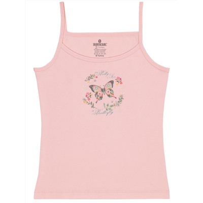 Майка для девочки на тонких бретелях. Модель приталенного кроя. Выполнена из эластичного х/б трикотажа кулирное полотно. Передняя половинка декорирована нежным принтом "Бабочки". Отделка выреза и пройм из эластичного трикотажного канта в тон полотна. Низ изделия подвернут и прошит двойной строчкой.