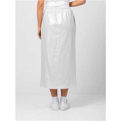 Модель прямого силуэта, длиной миди. Пояс эластичный, с кулисой и шнурком. Перед с запахом. В боковых швах карманы. Юбка декорирована швами с открытыми срезами.