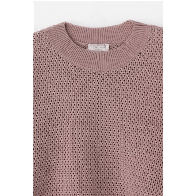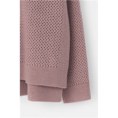 Джемпер с удлиненной спинкой и разрезами по бокам связан ажурной вязкой "волна". Средняя плотность вязания и пластичная фактура сохраняют форму изделия.