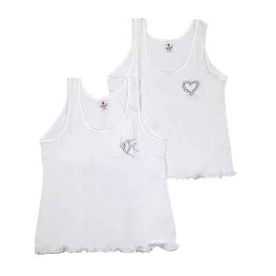 Маечка для девочки, укороченная, белого цвета, из эластичного, х/б трикотажа. Прямой силуэт. Широкие бретели отделаны эластичным, атласным кантом. Украшена принтом из цветных страз. Низ маечки с волнистым краем.
